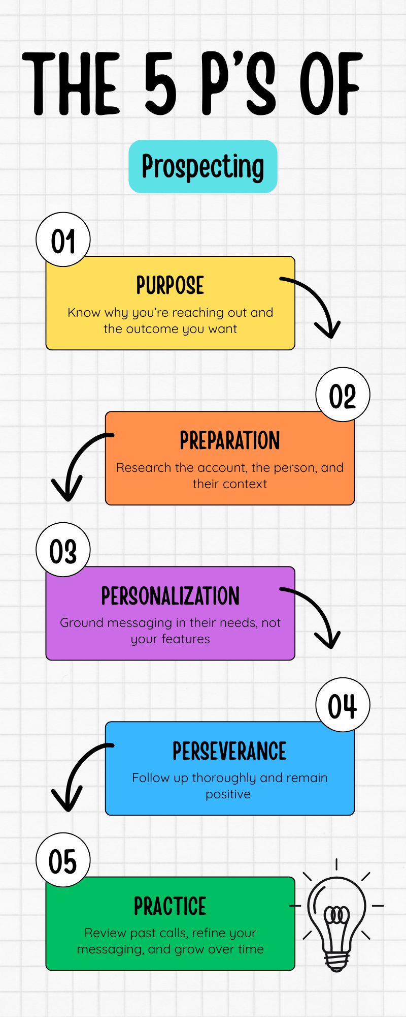Solid frameworks deliver consistent results, and no framework is more powerful in sales prospecting than the “5 Ps”. These are: