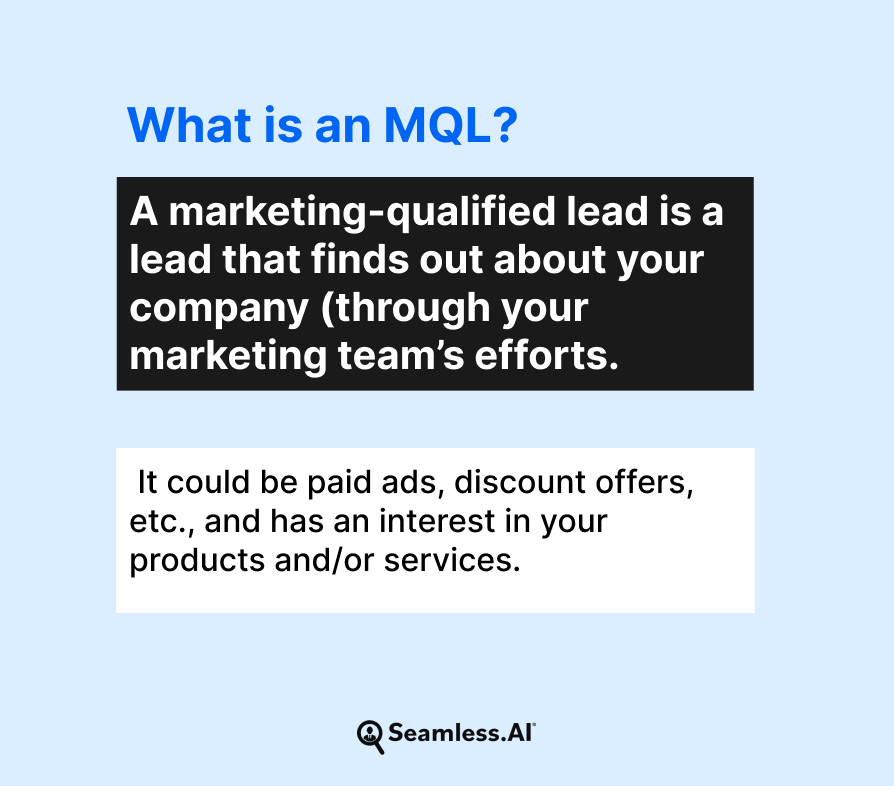 A marketing-qualified lead is a lead that finds out about your company (through your marketing team’s efforts. Such as paid ads, discount offers, etc.) and has an interest in your products and/or services.